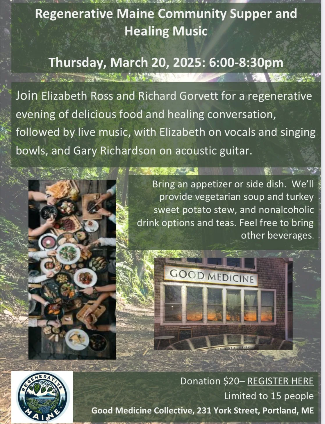 ReGen ME Community Supper, Conversation, and Music Thursday, March 20, 2025 6:00 PM 8:30 PM Google Calendar ICS Thursday, March 20, 2025 at 6:00pm. Elizabeth Ross Holmstrom @ 207-232-9375Thursday, February 20, 2025 at 6:00pm. Elizabeth Ross Holmstrom @ 207-232-9375