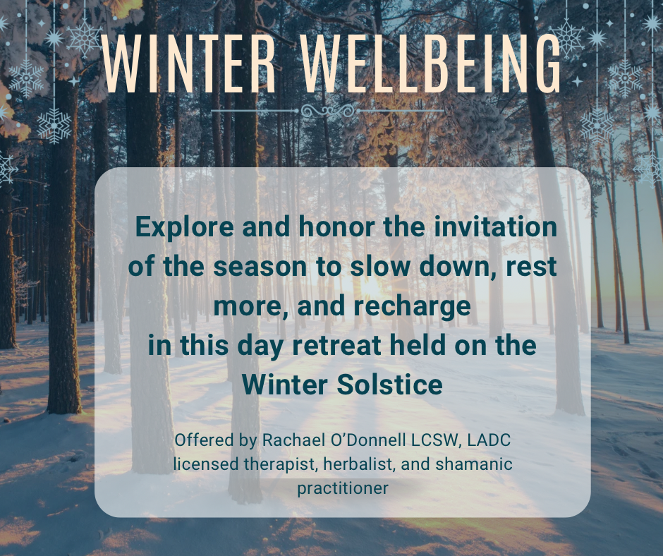 Winter can be a beautiful season of restoration and inner connection. This workshop will help you move through it feeling nurtured and have an experience of the winter season that is empowering rather than depleting.